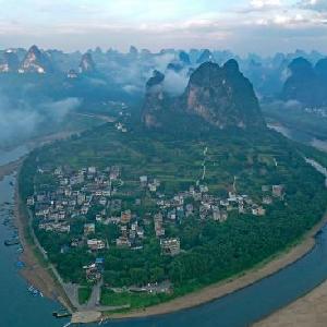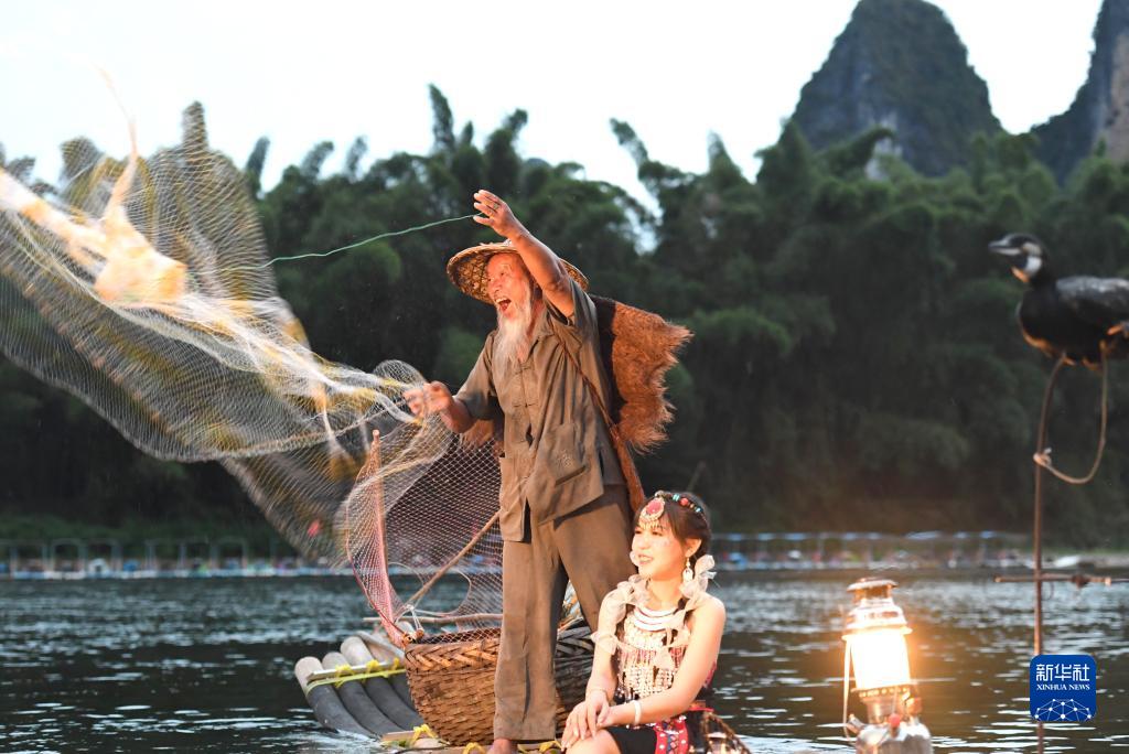 一名村民在漓江廣西陽(yáng)朔縣興坪鎮(zhèn)段的竹筏上協(xié)助游客拍攝旅游影像(2022年8月25日攝)。