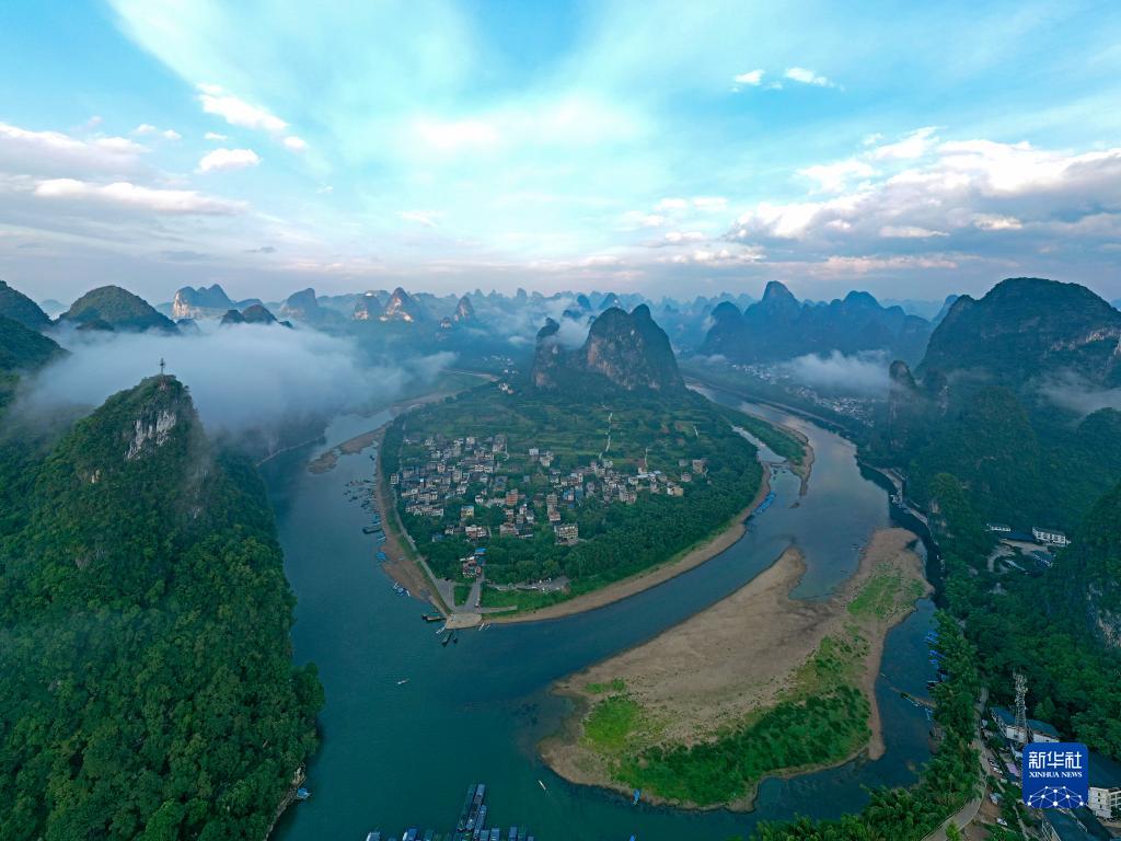 這是在廣西陽朔縣興坪鎮拍攝的漓江風光(2022年8月25日攝,無人機照片)。