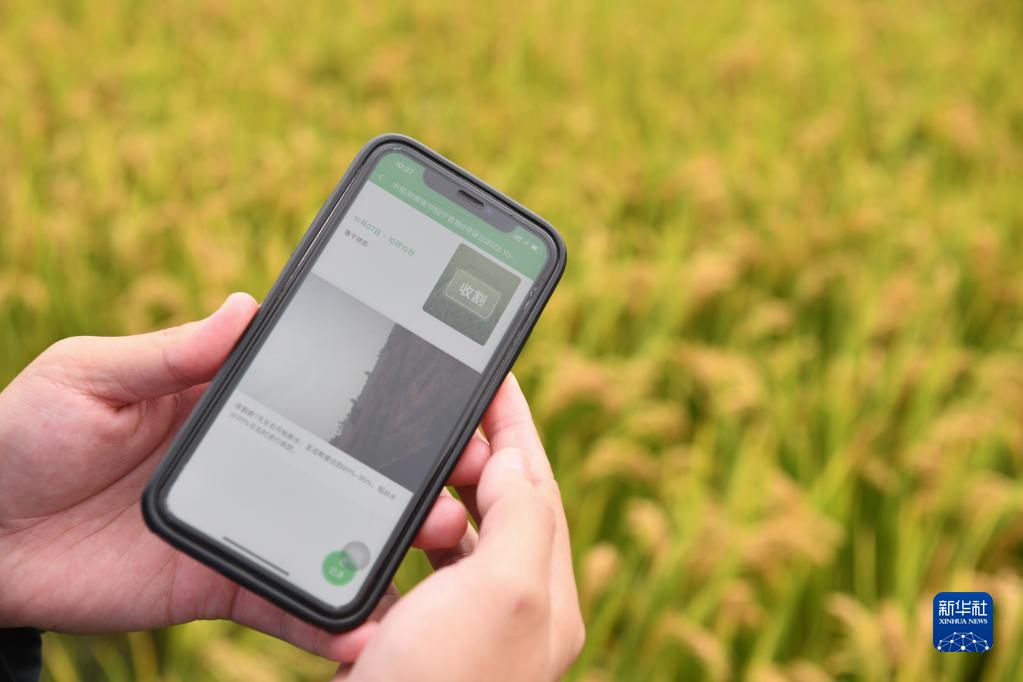 10月9日,在中聯智慧農業峨橋示范基地內,工作人員通過手機終端了解稻田合適的收割時間。