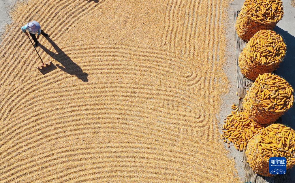 10月10日,山東省臨沂市郯城縣郯城街道農(nóng)民在晾曬收獲的玉米(無(wú)人機(jī)照片)。