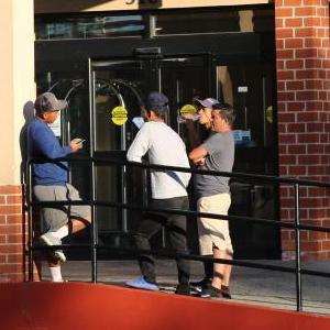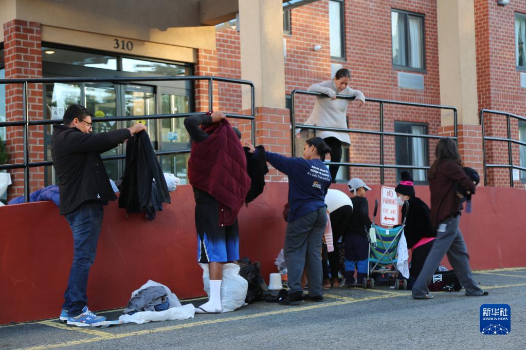 10月9日,安東尼奧·奧萬(wàn)多(左一)在美國(guó)紐約市斯塔滕島“舒適”旅館前挑選適合家人的衣服。