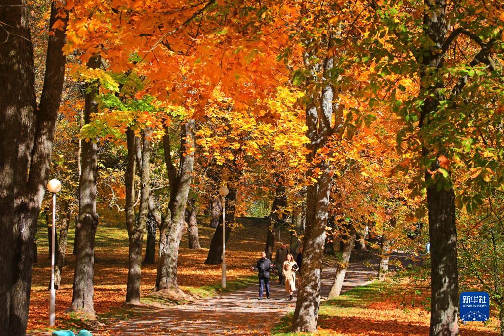 10月10日,人們在白俄羅斯明斯克一處公園散步。