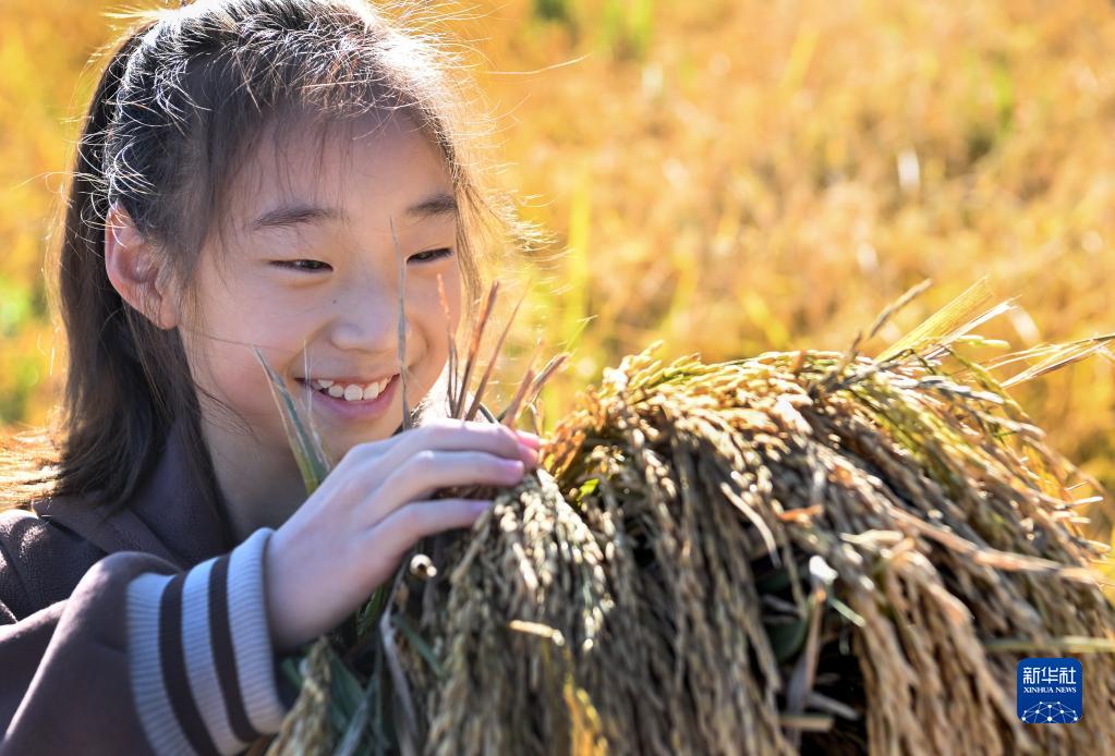 10月11日,一位小朋友在觀察豐收的稻穗。
