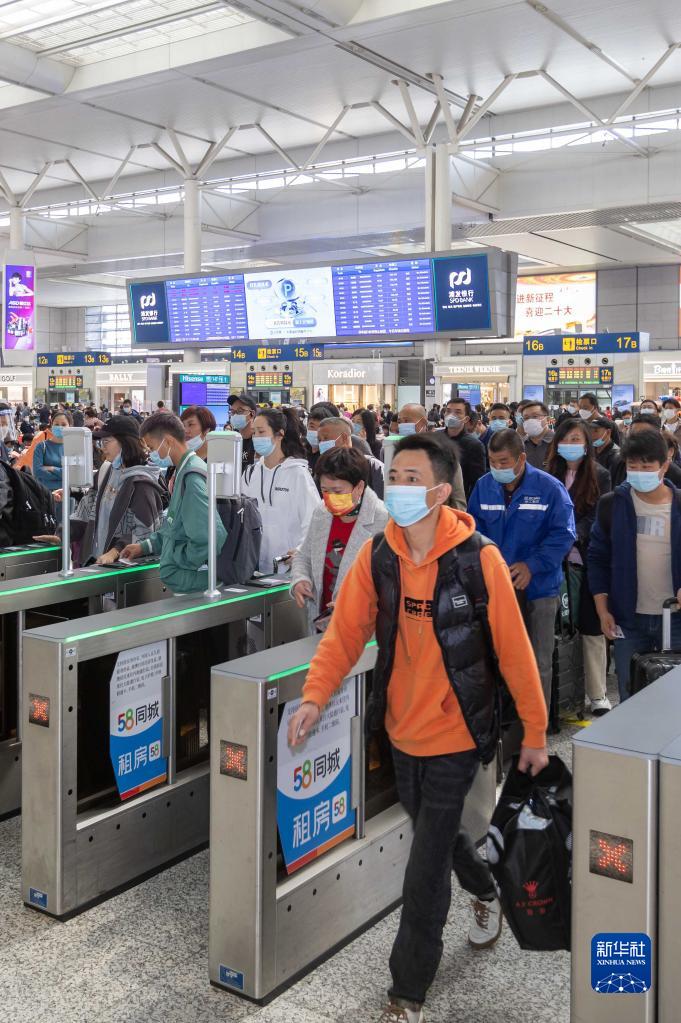 10月11日,在上海虹橋火車站,旅客通過檢票閘機(jī)進(jìn)站。