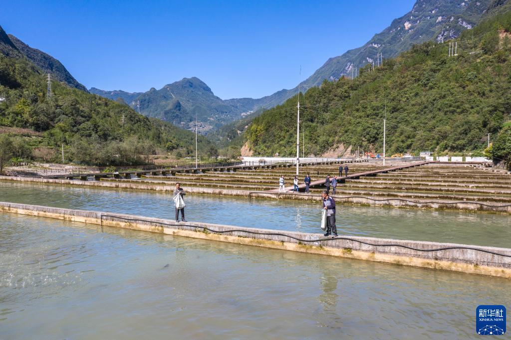 10月11日,在重慶市城口縣蓼子鄉明安村冷水魚產業基地,工作人員為虹鱒魚投喂魚食(無人機照片)。