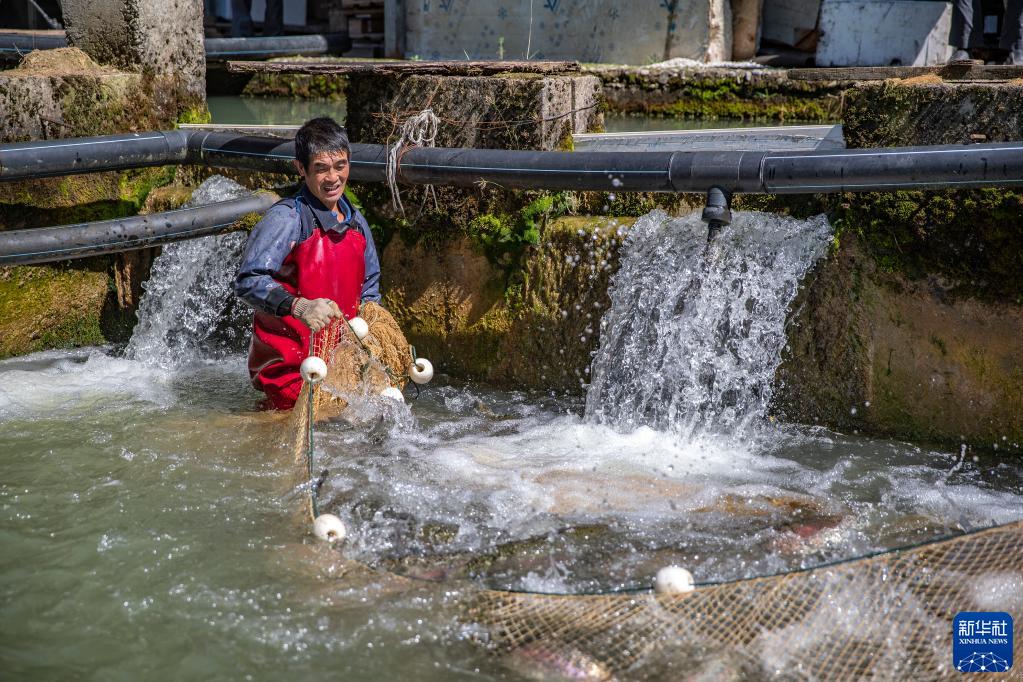 10月11日,在重慶市城口縣蓼子鄉明安村冷水魚產業基地,工作人員在捕撈準備出售的虹鱒魚。