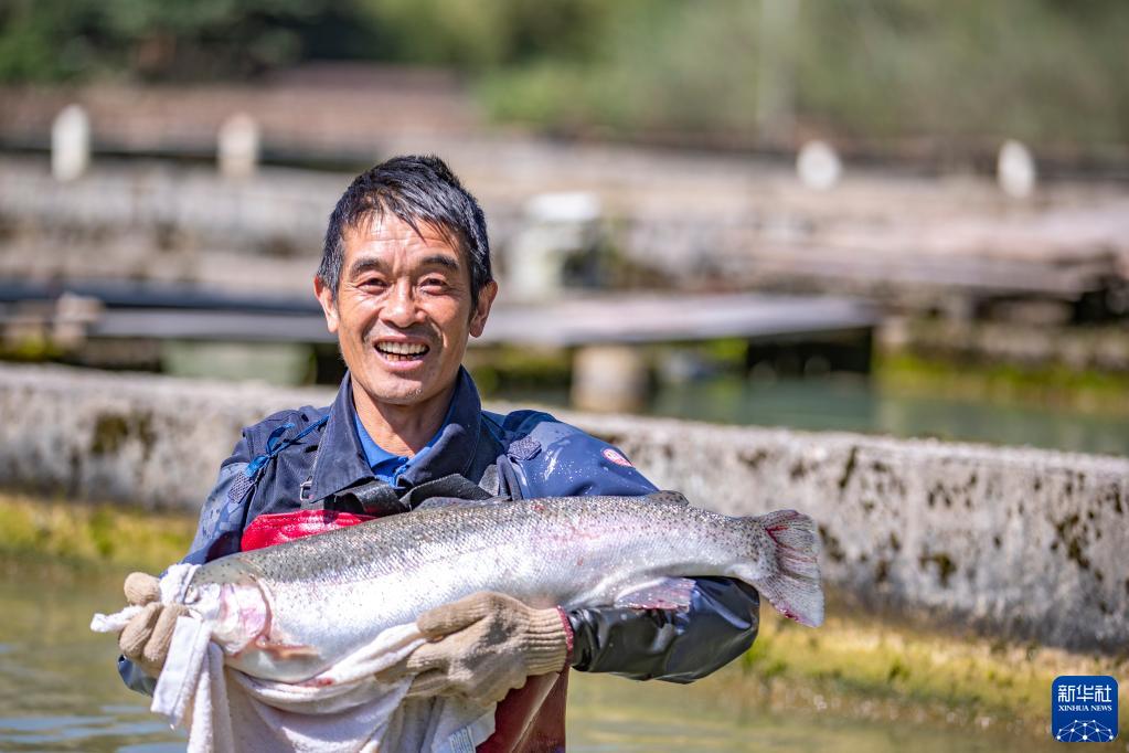 10月11日,在重慶市城口縣蓼子鄉明安村冷水魚產業基地,工作人員在展示剛剛捕撈的虹鱒魚。