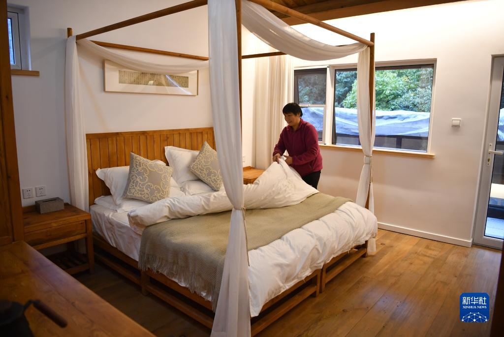 在寧陜縣廣貨街鎮沙溝村由閑置破舊農房改造而成的民宿中,村民張勝霞在整理臥室床鋪(10月9日攝)。 新華社記者邵瑞攝