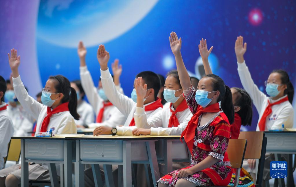 10月12日,學生在云南省大理新世紀中學收看“天宮課堂”第三課時舉手提問。 新華社記者 陳欣波 攝