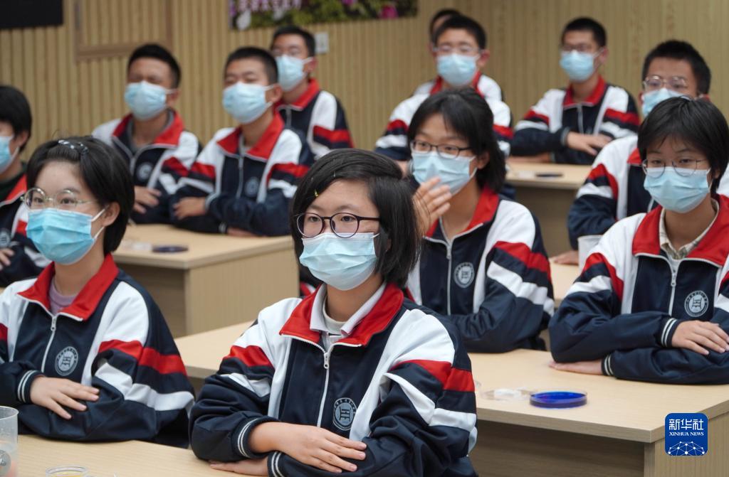10月12日,學生在山東省菏澤第一中學收看“天宮課堂”第三課。 新華社記者 徐速繪 攝