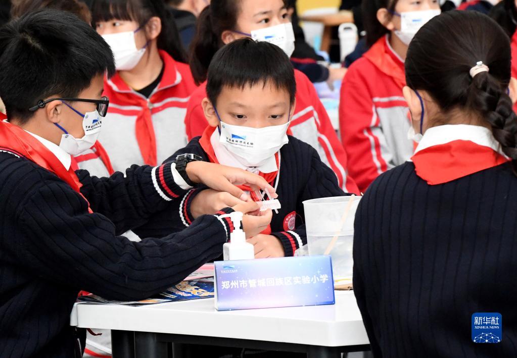 10月12日,學(xué)生在河南省科技館收看“天宮課堂”第三課時(shí)做實(shí)驗(yàn)。 新華社記者 李安 攝
