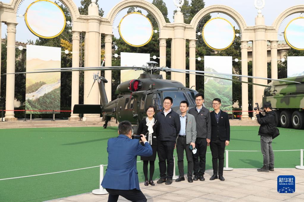 觀眾在“奮進新時代”主題成就展室外展區(qū)與直升機合影(10月12日攝)。新華社記者 許雅楠 攝