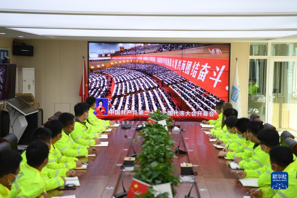10月16日,在河北雄安新區中建二局容東項目部,工作人員在收看中國共產黨第二十次全國代表大會開幕會。