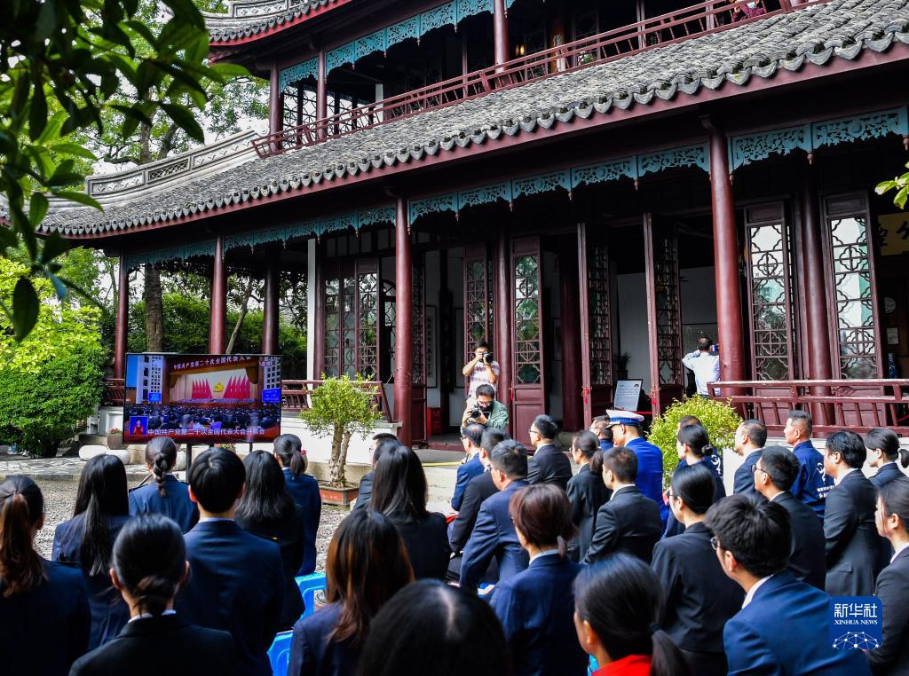 10月16日,浙江嘉興南湖區的黨員在南湖湖心島收看中國共產黨第二十次全國代表大會開幕會。