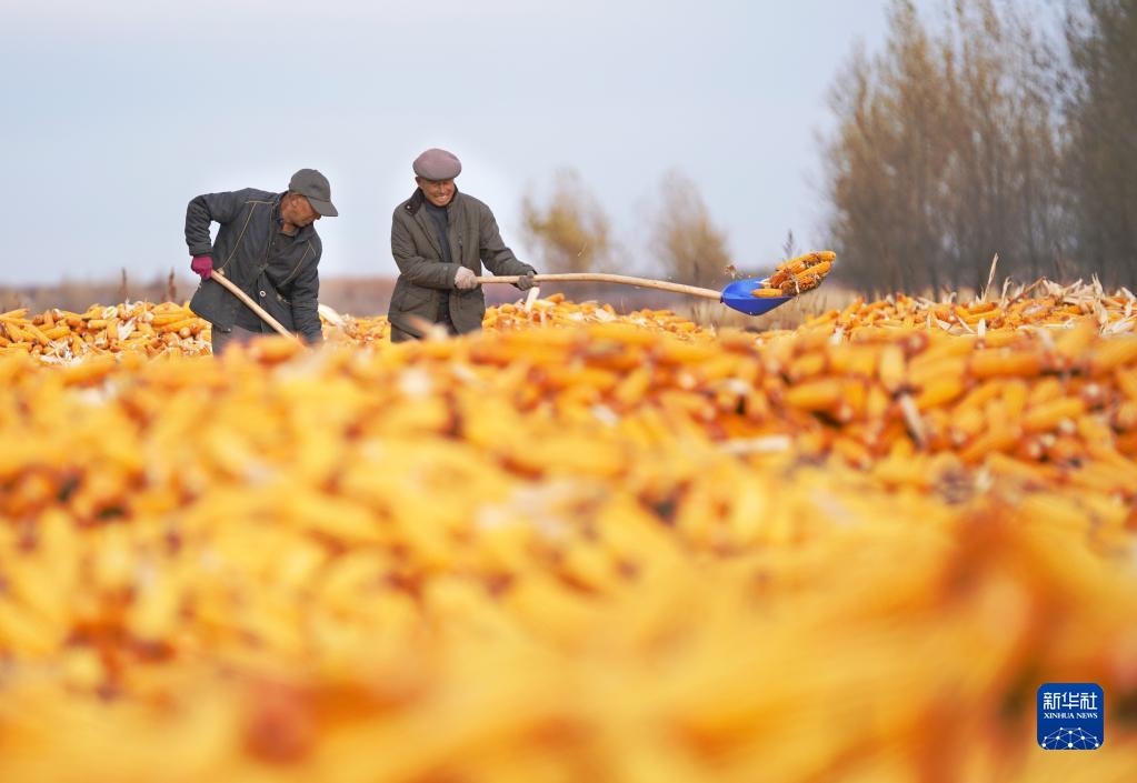 10月15日,在黑龍江省拜泉縣上升鄉(xiāng)上升村,農(nóng)民在翻曬玉米。