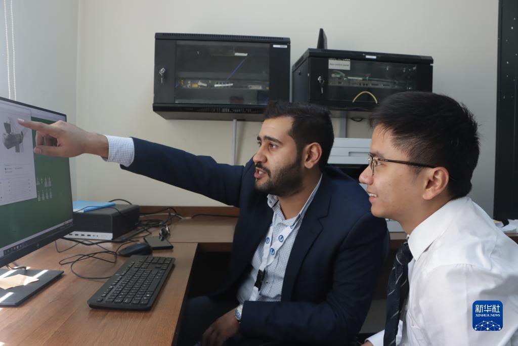 9月19日,在約旦舒巴克風電站,三峽國際約旦新能源項目工程師江崧瑋(右)與舒巴克風電站現場運維工程師奈扎爾·阿勒胡沙曼交流工作。