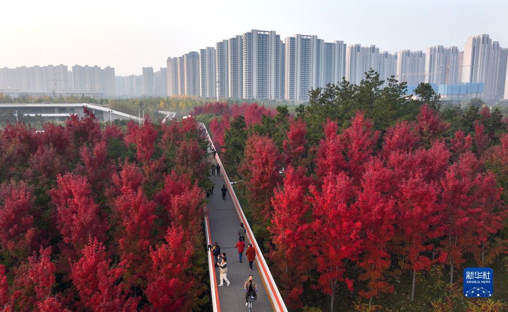 近日,古城西安市雁塔區雁南公園里秋色正濃,吸引游客賞景游玩。
