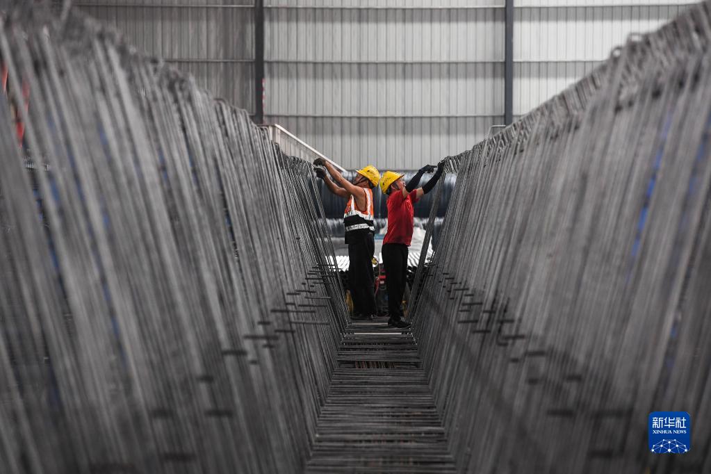 10月18日,工人在黃茅海跨海通道智慧梁場綁扎預制箱梁鋼筋籠。
