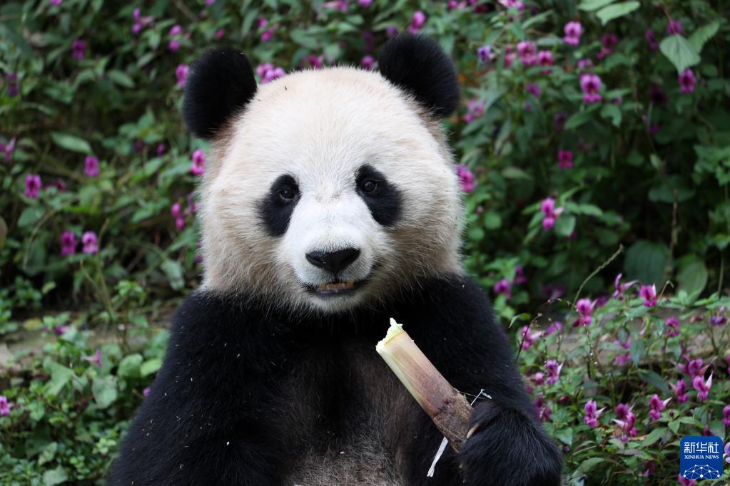 10月17日,在中國大熊貓保護研究中心雅安基地,大熊貓“四?!痹诔灾褡?。