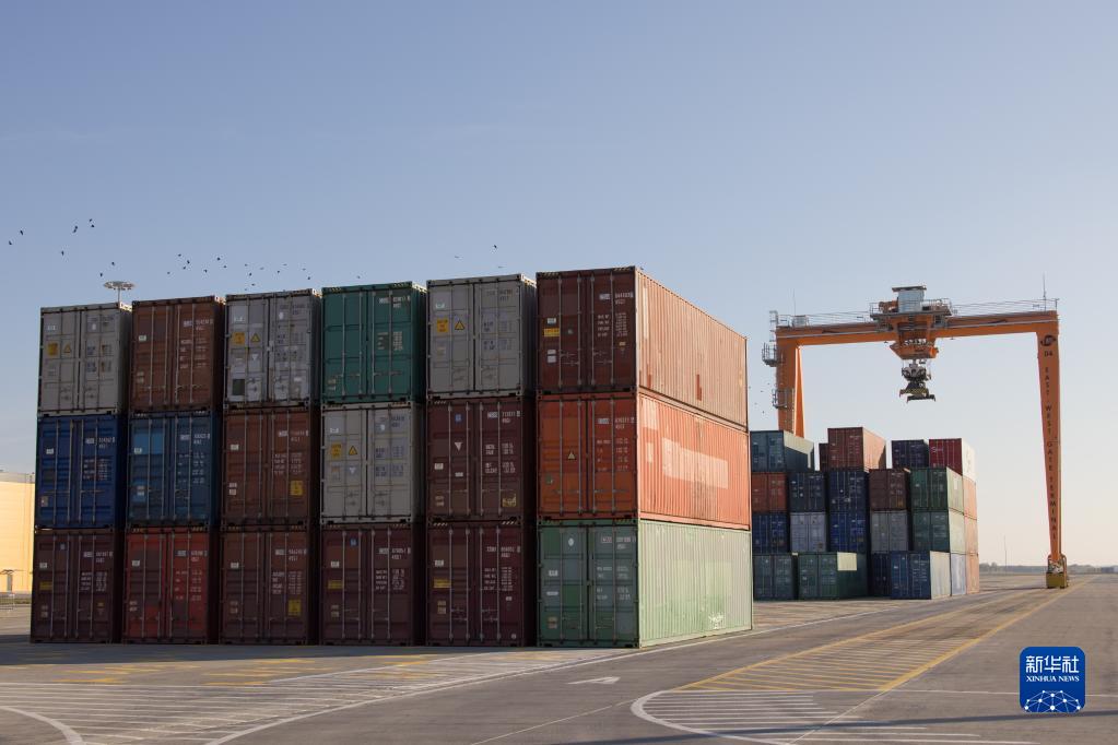 這是10月18日在匈牙利費涅什利特凱的東西門場站拍攝的集裝箱和由5G技術遠程控制的龍門起重機。