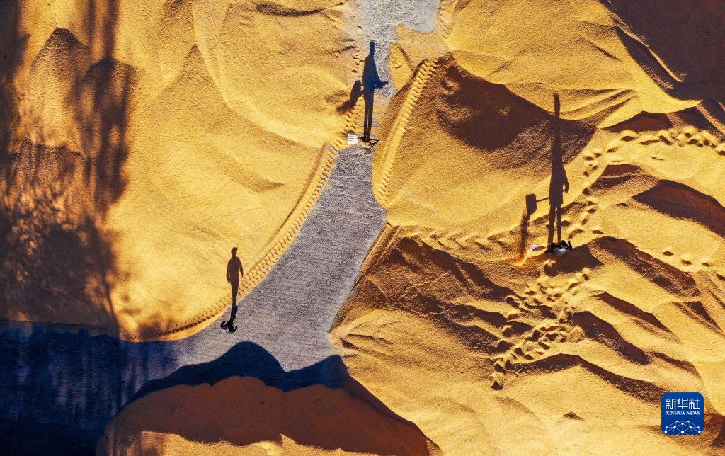 10月18日,在通遼市奈曼旗新鎮舍布日圖嘎查,工人在收糧站晾曬玉米(無人機照片)。