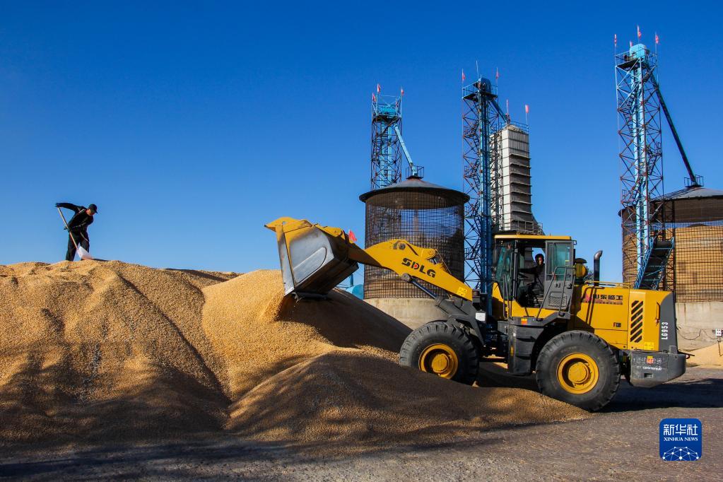 10月18日,在通遼市奈曼旗新鎮舍布日圖嘎查,工人在收糧站晾曬玉米。