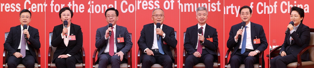 10月19日,中國(guó)共產(chǎn)黨第二十次全國(guó)代表大會(huì)新聞中心舉行集體采訪。重慶、四川、貴州、云南、西藏、陜西、甘肅代表團(tuán)新聞發(fā)言人出席,介紹代表團(tuán)學(xué)習(xí)討論二十大報(bào)告情況,并回答記者提問(wèn)(拼版照片)。