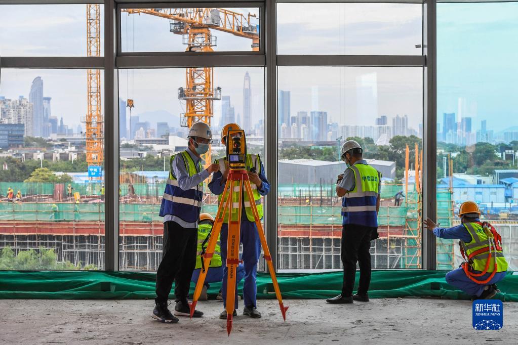 由中建深裝承建的央企中國電子總部大廈進入幕墻同步安裝階段,技術人員在對首片弧面幕墻玻璃進行放線測量(10月19日攝)。