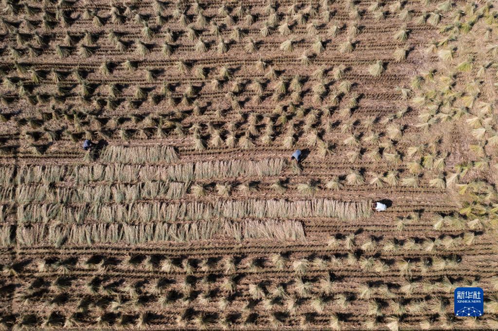 10月19日,種植戶在杭州市富陽(yáng)區(qū)漁山鄉(xiāng)糧食生產(chǎn)功能區(qū)的稻田內(nèi)捆扎秸稈(無(wú)人機(jī)照片)。漁山鄉(xiāng)糧食生產(chǎn)功能區(qū)毗鄰富春江,面積1700余畝,采取統(tǒng)一品種布局、統(tǒng)一測(cè)土配方、統(tǒng)一機(jī)插、統(tǒng)一病蟲害防治、統(tǒng)一機(jī)收、統(tǒng)一信息發(fā)布的“六統(tǒng)一”栽培技術(shù),成為富陽(yáng)成效顯著的糧食生產(chǎn)示范基地之一。