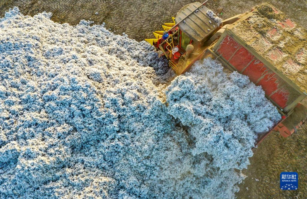 在新疆沙雅縣紅旗鎮(zhèn)一處棉田里,采棉機(jī)在卸棉(10月17日攝,無(wú)人機(jī)照片)。