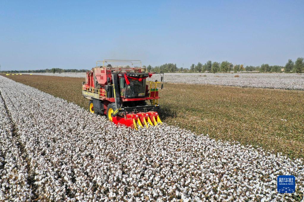在新疆巴音郭楞蒙古自治州尉犁縣興平鎮巴西阿瓦提村的一塊棉田里,國產采棉機在采收棉花(10月14日攝,無人機照片)。