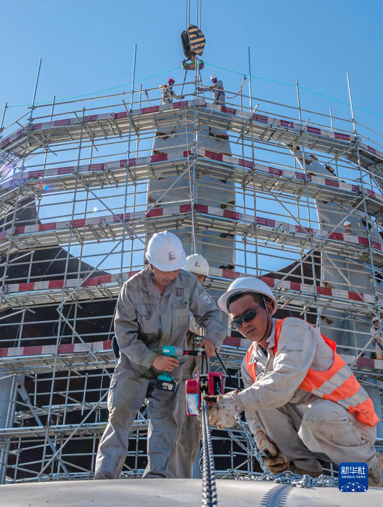 在中石化天津南港乙烯項目建設現場,施工人員在固定鋼板(9月9日攝)。