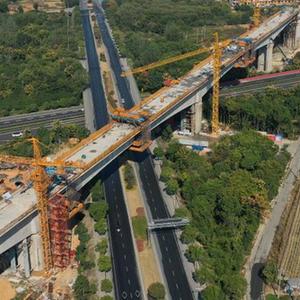 10月20日拍攝的杭溫鐵路二期工程跨杭黃鐵路特大橋完成合龍的最大跨度連續梁(無人機照片),該連續梁同時上跨杭新景高速公路和桐廬縣鳳川大道。