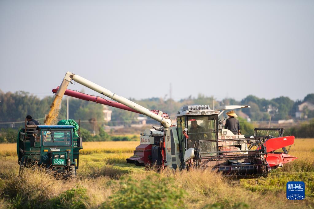 10月20日,在湖南省常德市鼎城區謝家鋪鎮,收割機把收好的稻谷轉放到運輸車里。