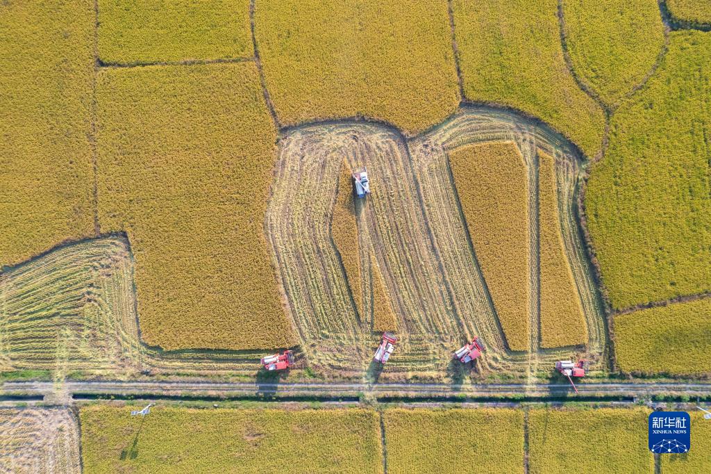 10月20日,在湖南省常德市鼎城區(qū)謝家鋪鎮(zhèn),農(nóng)民駕駛農(nóng)機(jī)收割晚稻(無人機(jī)照片)。