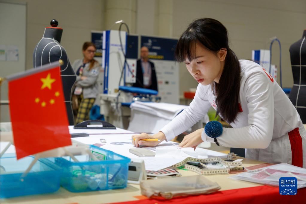 10月20日,湖南工藝美術職業學院董青在芬蘭首都赫爾辛基參加2022年世界技能大賽特別賽芬蘭賽區比賽時裝技術項目。新華社發(卡勒·帕爾基寧攝)