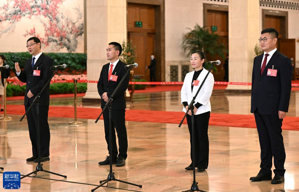 這是閉幕會后,楊新泉、劉秀祥、石玉蓮、安長明代表(自左至右)接受采訪。