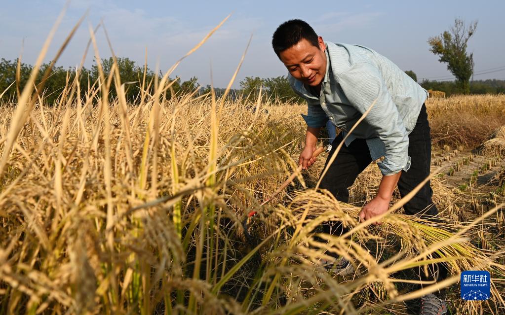 在西安市長安區王曲街道皇甫村,村民在收割水稻(10月21日攝)。