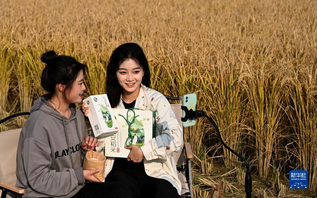在西安市長安區王曲街道皇甫村,兩名主播在稻田邊直播銷售當地的桂花球大米(10月21日攝)。