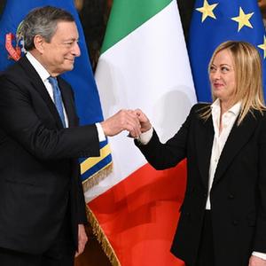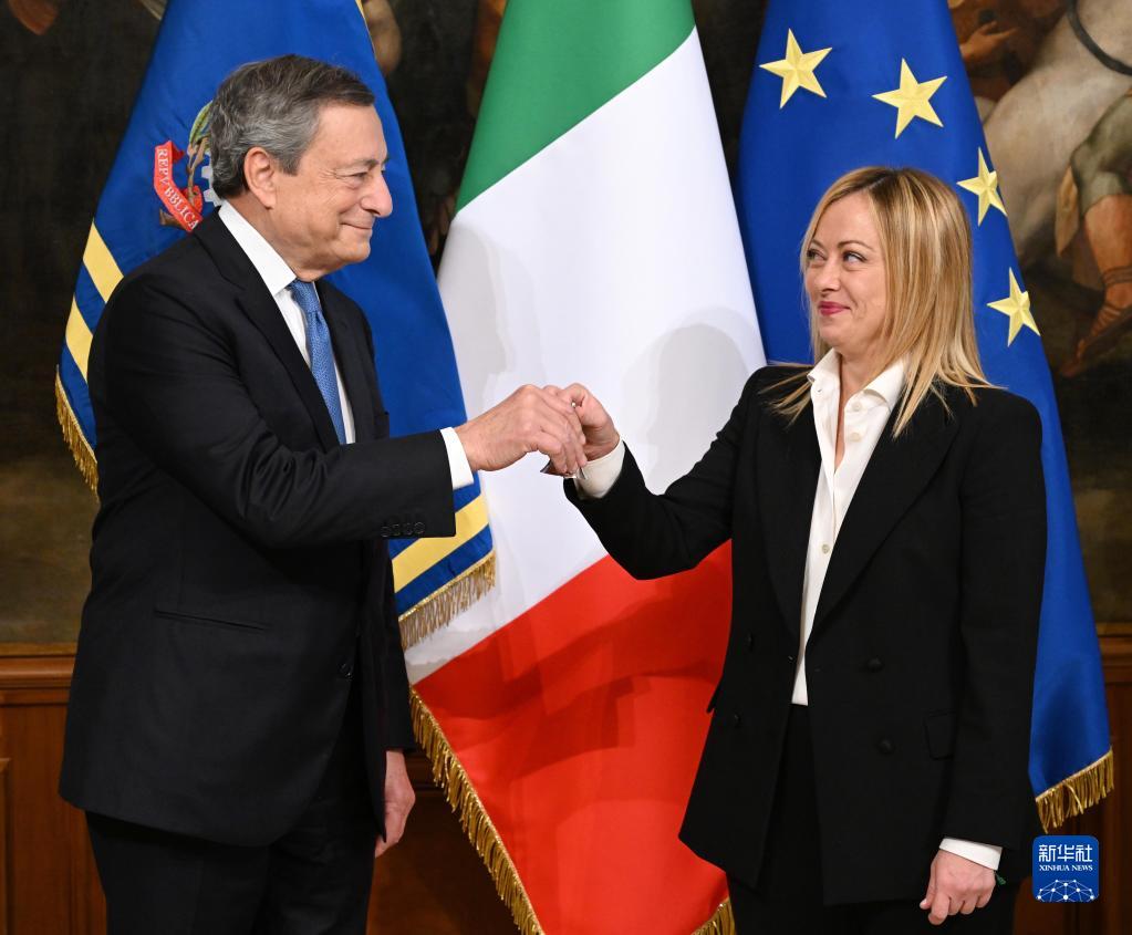 10月23日,在意大利羅馬,新任總理焦爾吉婭·梅洛尼(右)從前總理德拉吉手中接過主持內閣會議的鈴鐺。