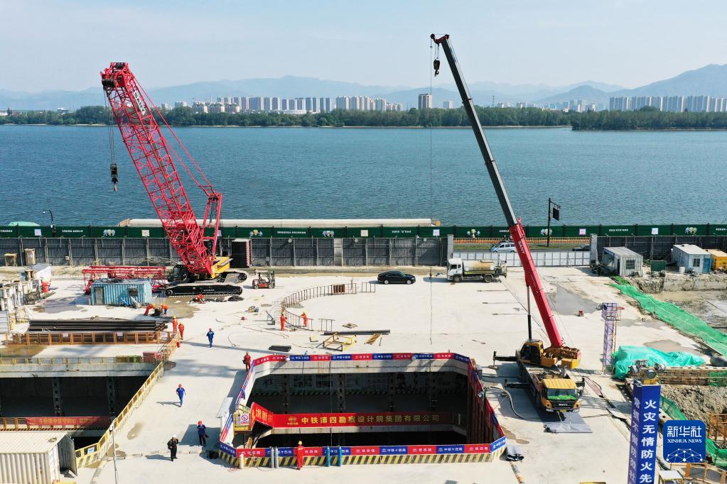 10月24日在浙江省杭州市富陽區(qū)拍攝的秦望通道工程過江隧道盾構(gòu)機接收工作井(無人機照片)。