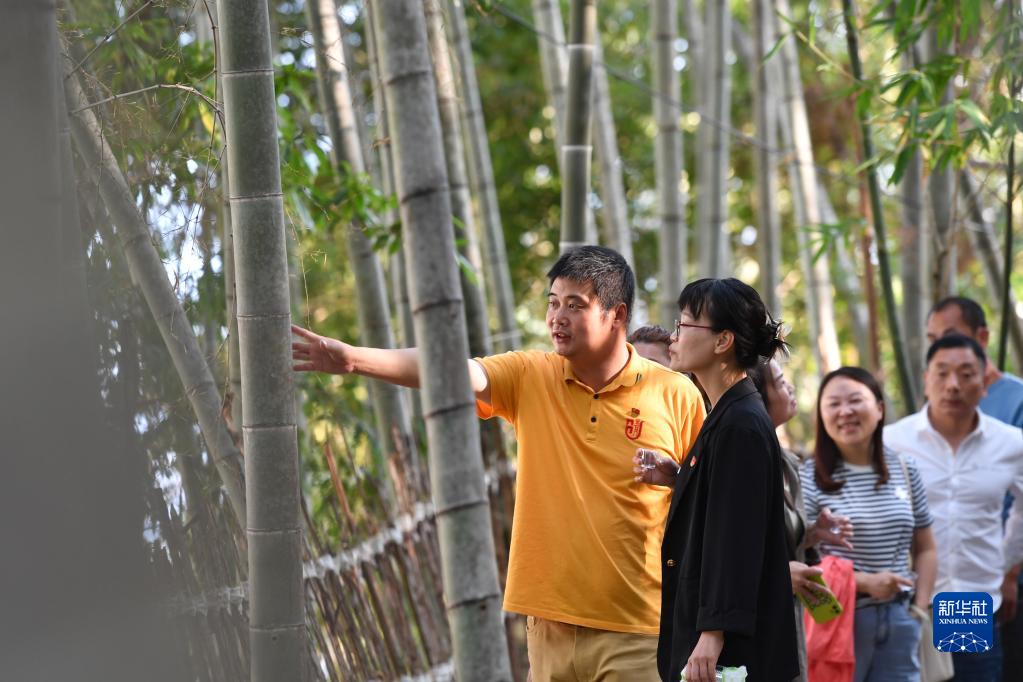 10月23日,在占西坑村竹酒生產(chǎn)基地,陳清(左一)向前來(lái)“取經(jīng)”的創(chuàng)業(yè)青年介紹竹酒生產(chǎn)技術(shù)。