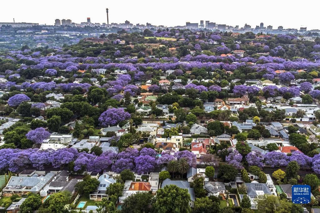 這是10月24日在南非約翰內斯堡拍攝的盛開的藍花楹(無人機照片)。