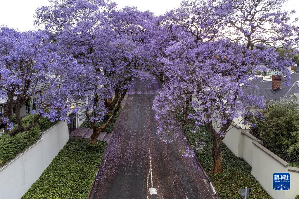 這是10月24日在南非約翰內斯堡拍攝的盛開的藍花楹(無人機照片)。