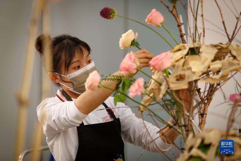 10月23日,獲花藝項(xiàng)目優(yōu)勝獎的上海農(nóng)林職業(yè)技術(shù)學(xué)院楊靈芝在芬蘭首都赫爾辛基參加2022年世界技能大賽特別賽芬蘭賽區(qū)比賽。