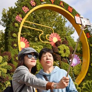 10月25日,游客在菊花展上拍照留念。