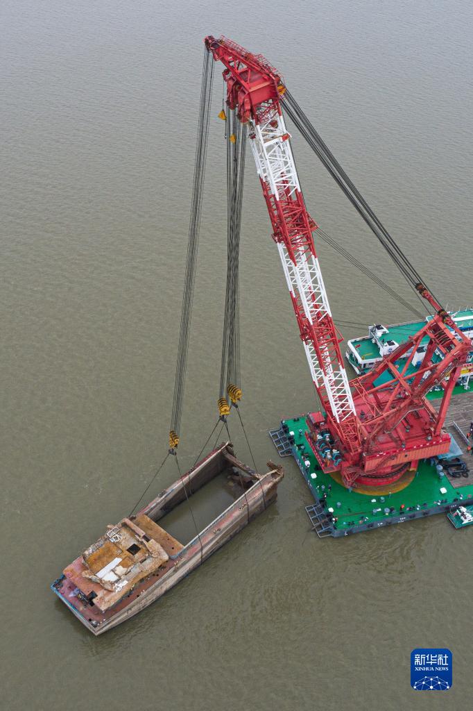 10月25日,礙航歷史沉船“二航9566”被吊出水面(無人機照片)。 新華社記者 肖藝九 攝