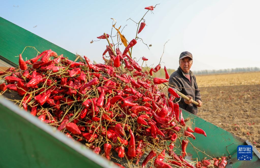 10月25日,在開魯縣東風鎮東方紅村,村民在田間收獲紅干椒。