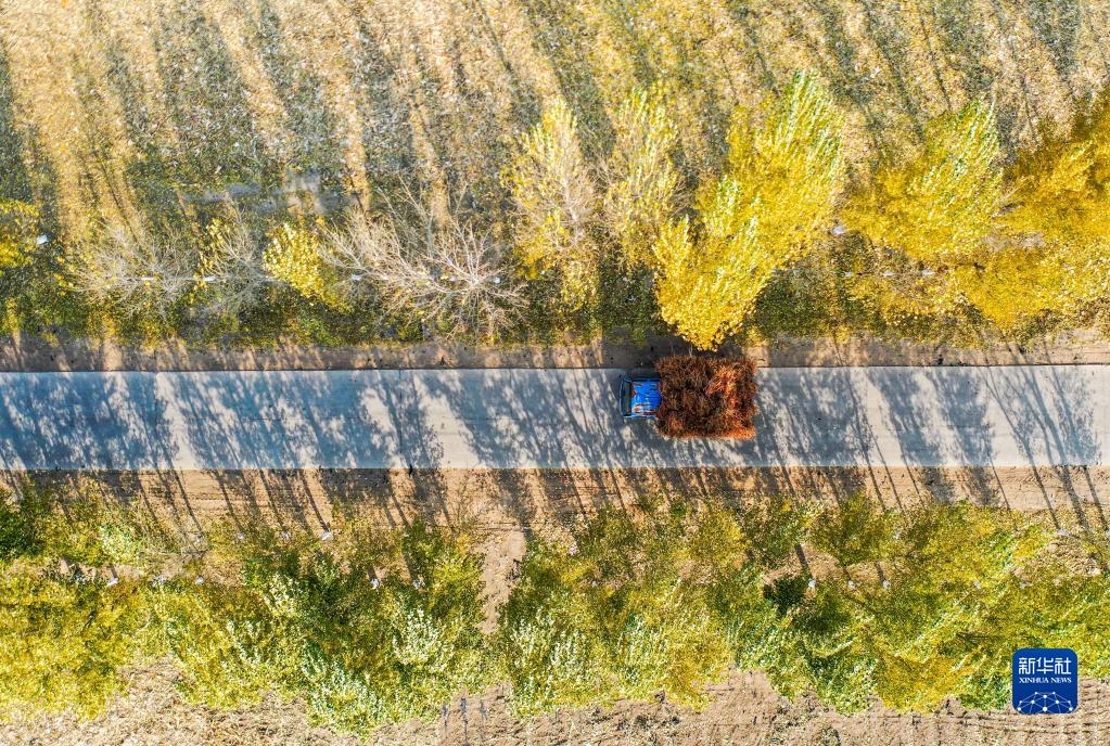 10月25日,在開魯縣東風鎮東方紅村,村民運輸收獲的紅干椒(無人機照片)。