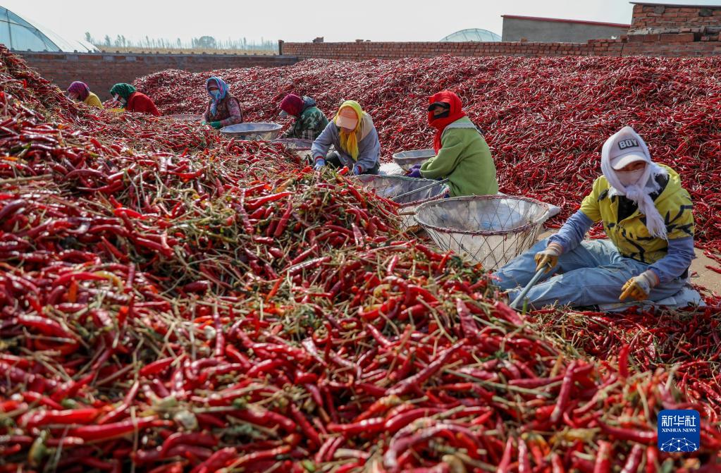 10月25日,在開魯縣東風鎮東方紅村,工作人員分揀處理紅干椒。